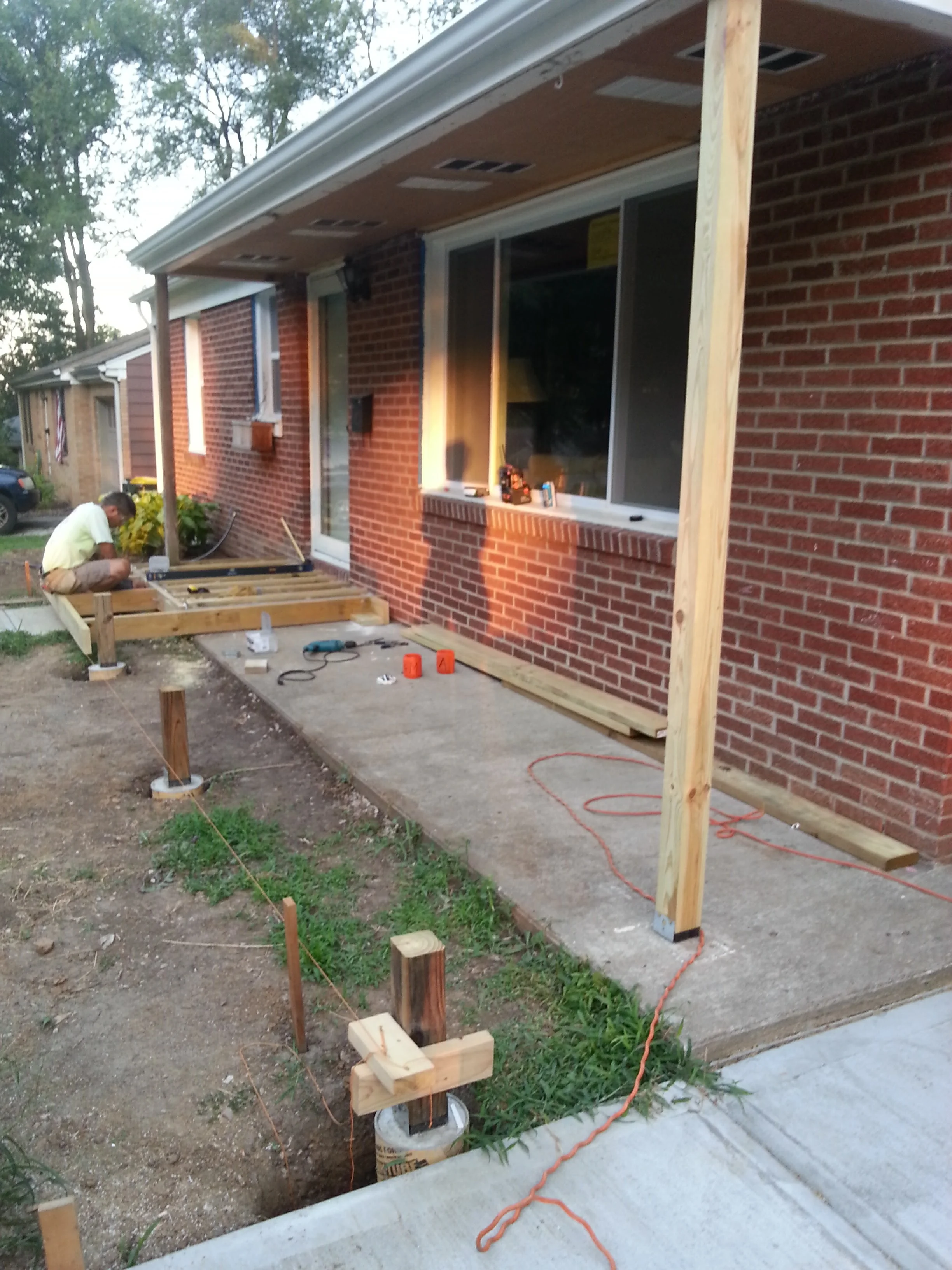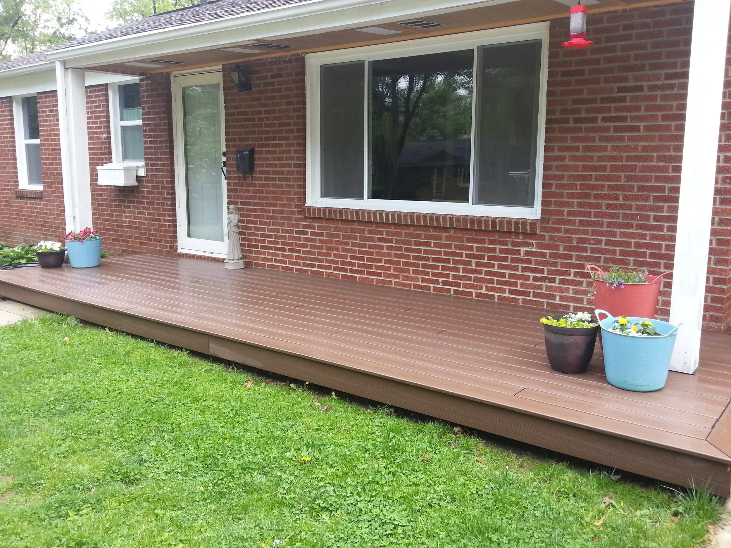 This concrete slab porch was raised and enlarged with composite wood decking, creating a more welcome and useful space at the front of the house.